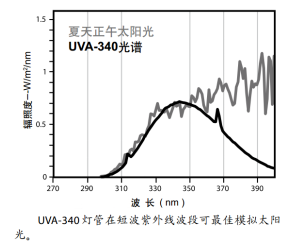a) UVA-340: 能发出从315nm到400nm间的太阳光的波长,它的辐射峰值是在340nm处。UVA-340对不同试验的对照测试尤其有用,在短波紫外线波段可最佳模拟太阳光。